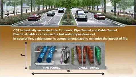 特点:容纳供水管道、通信电缆、电力电缆,甚至垃圾收集系统。管廊距地面3米,全长3.9千米,工程耗资8亿新元(约合35.86亿元人民币)。